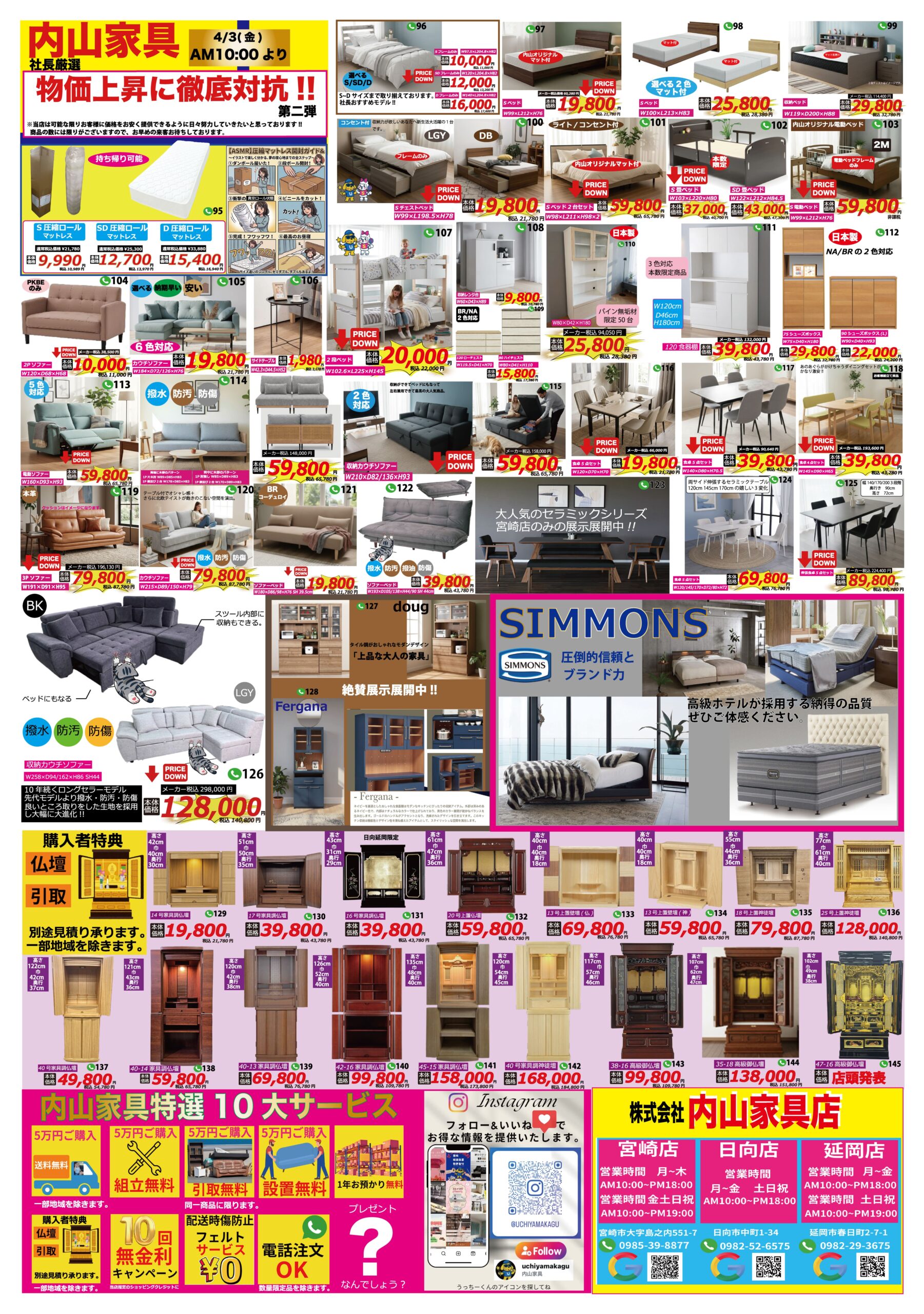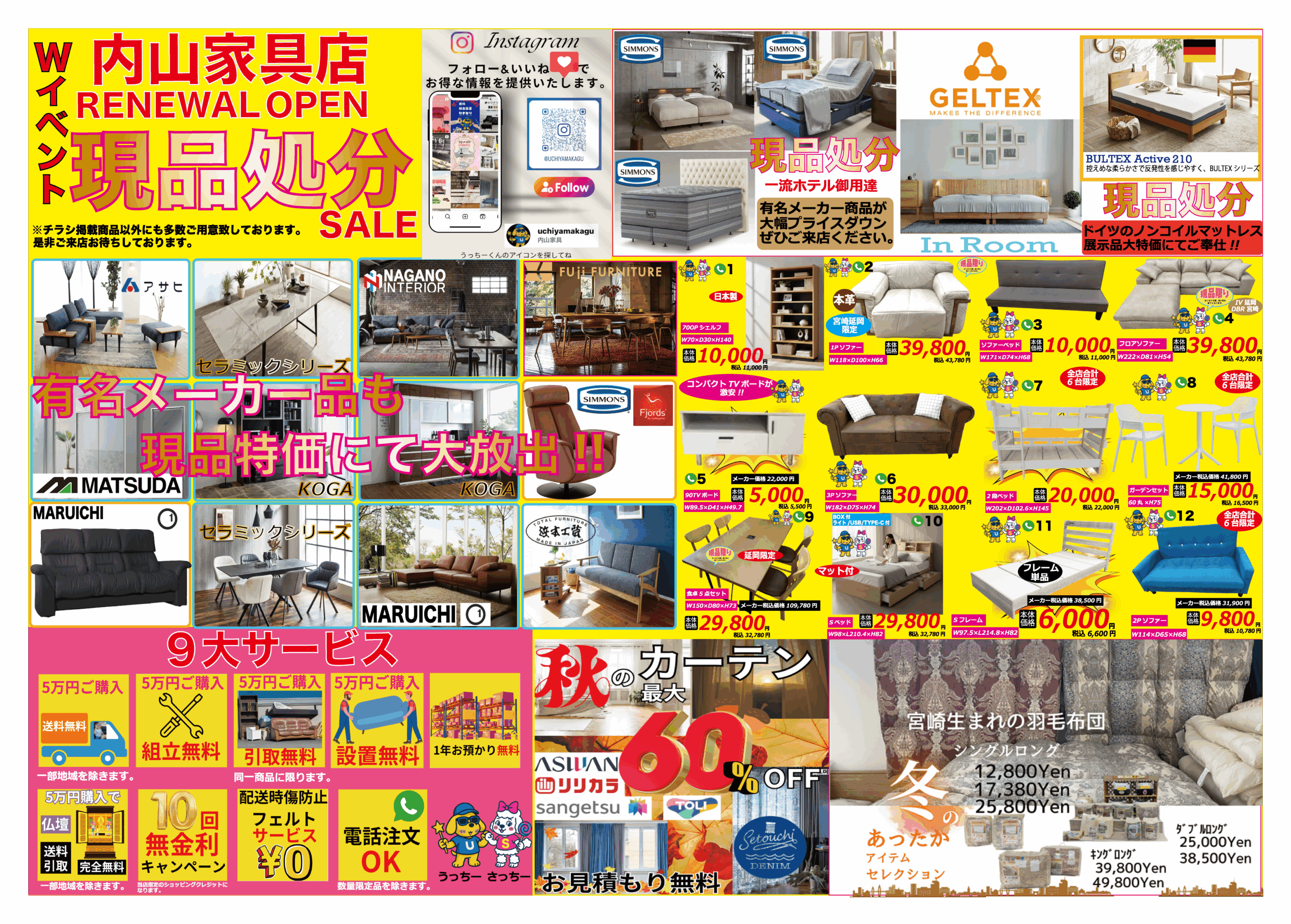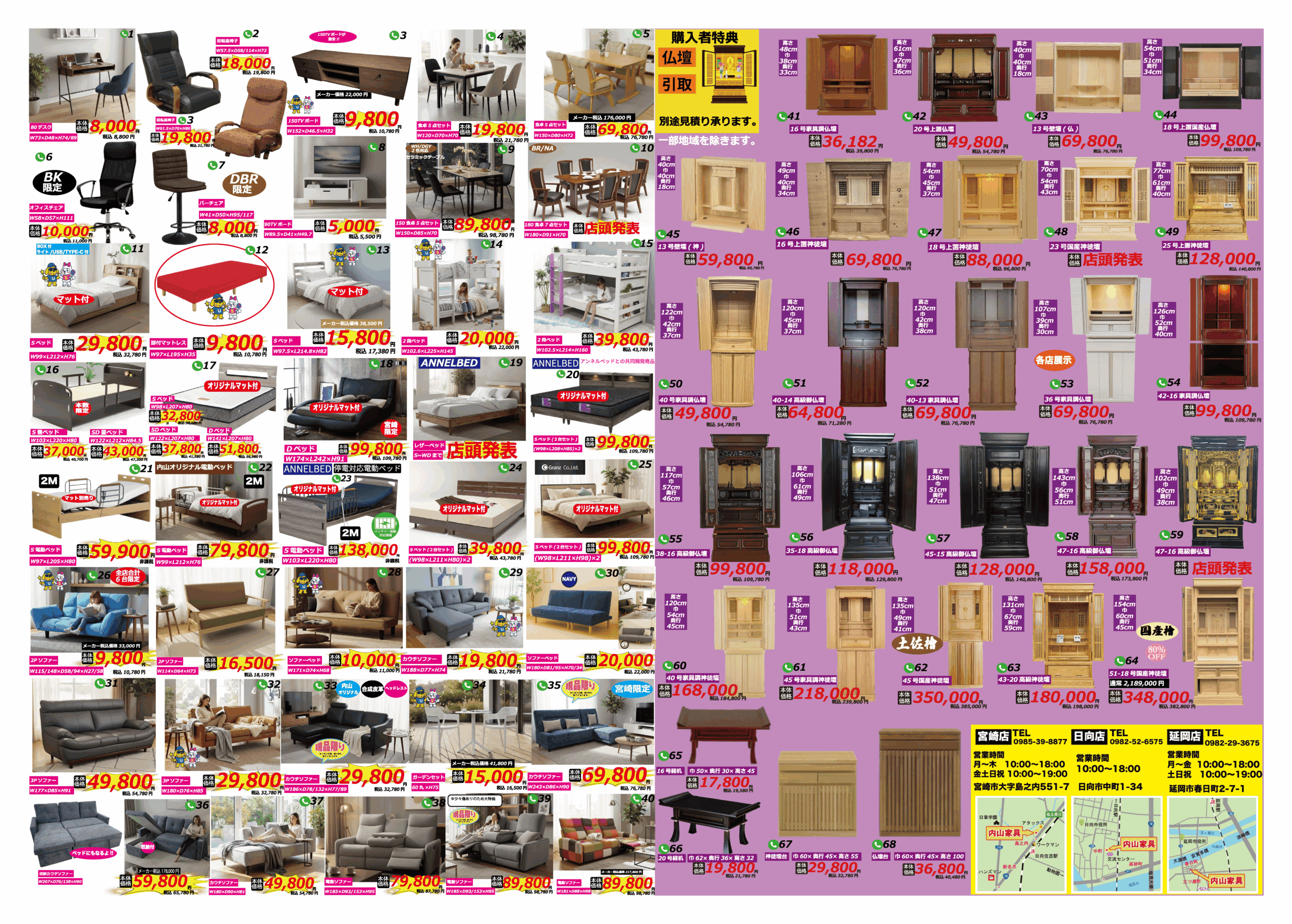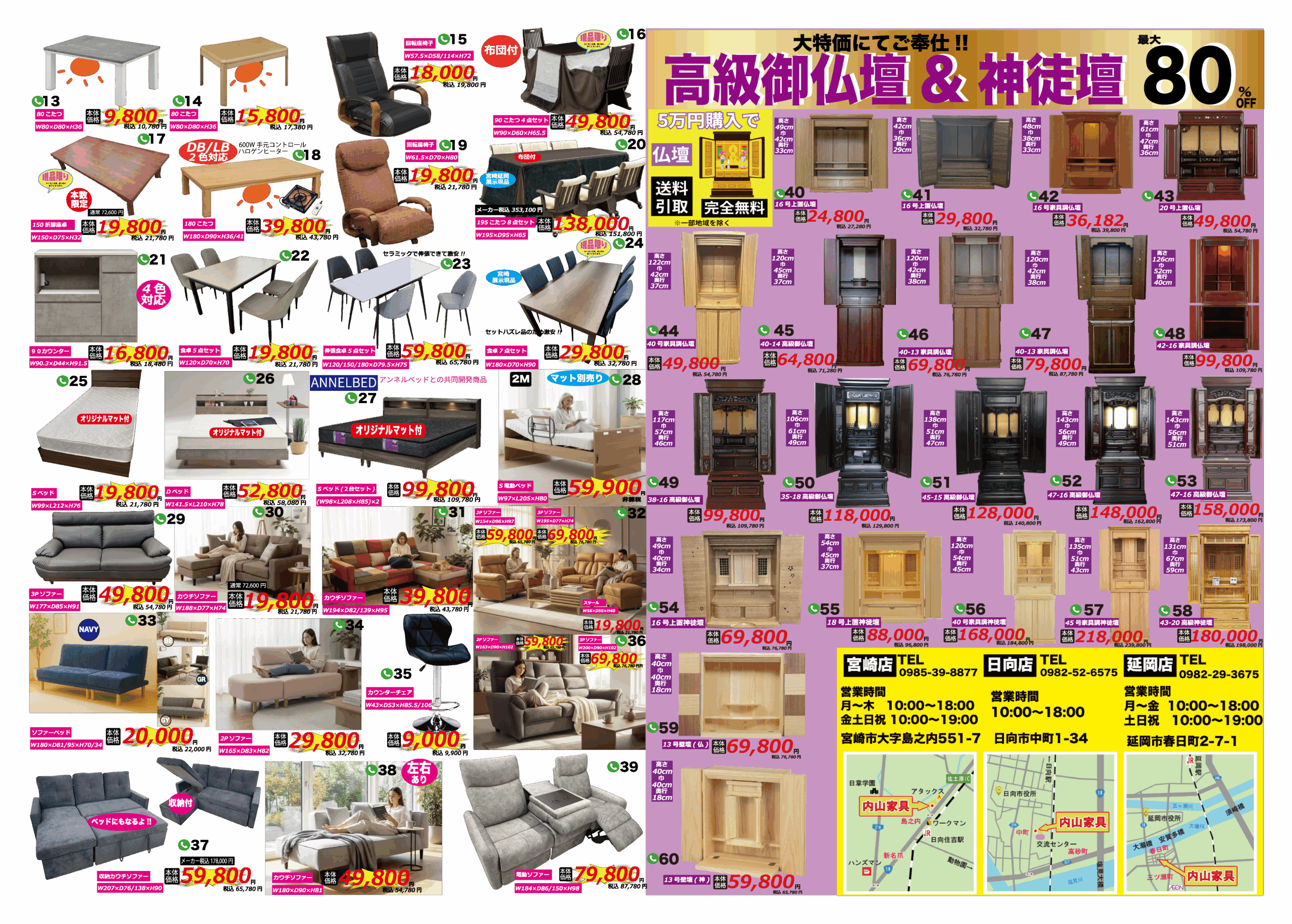 内山家具 宮崎本店〒880-0121宮崎市大字島之内551-7TEL:0120-11-5687(EC直通ダイヤル)TEL:0985-39-8877(店舗ダイヤル)FAX:0985-39-8844代表取締役:稲吉 勇介