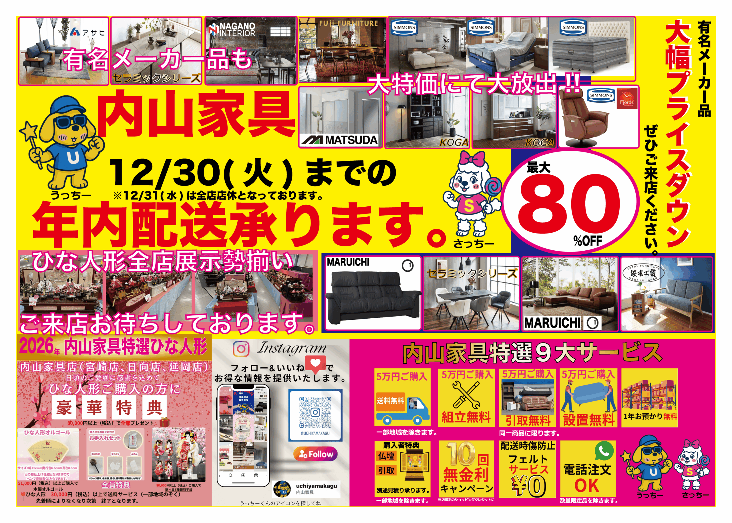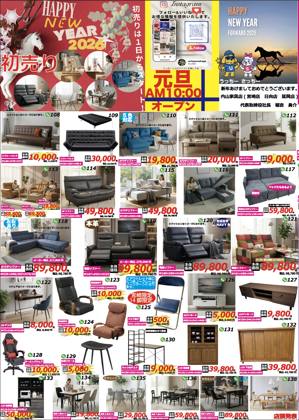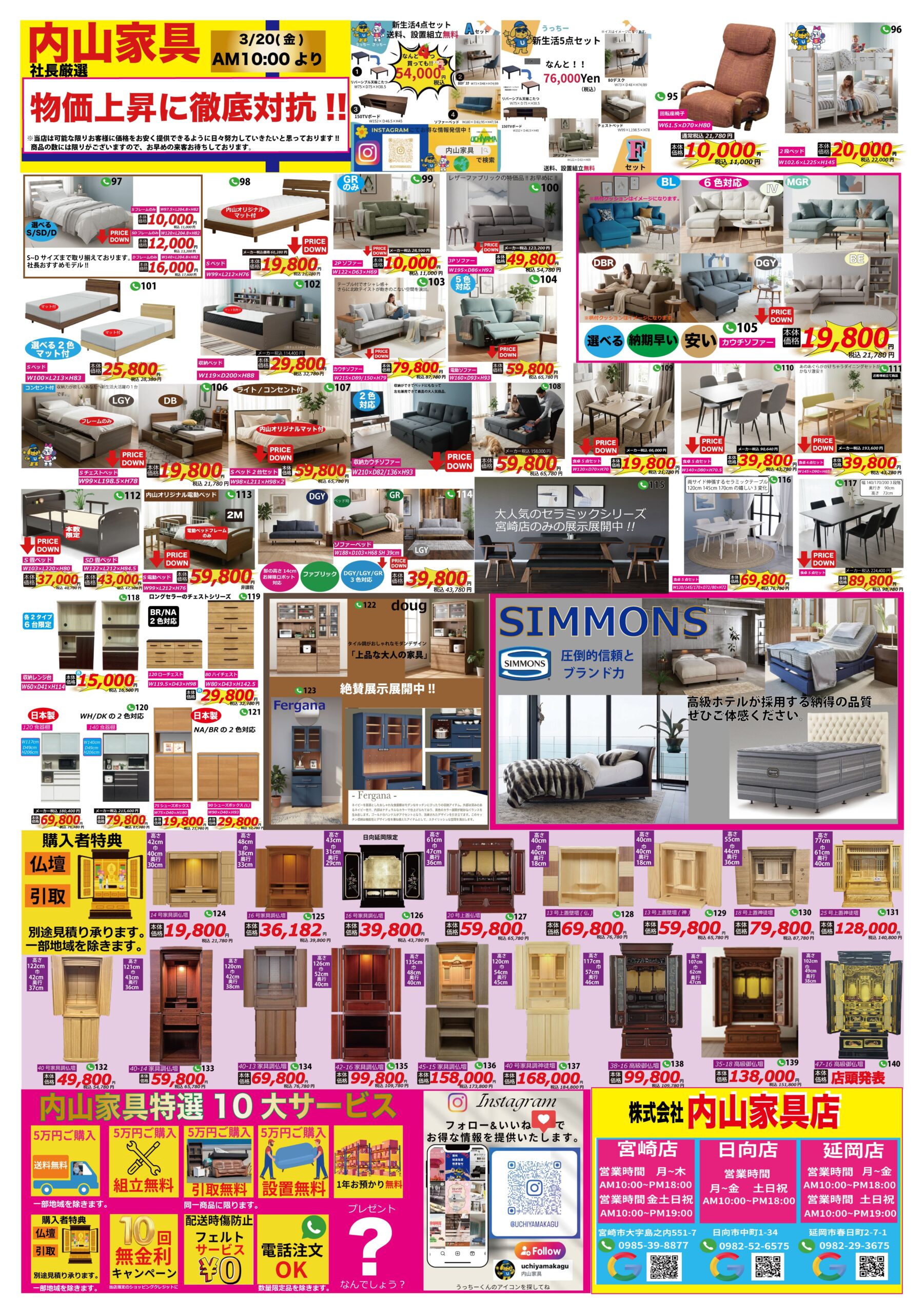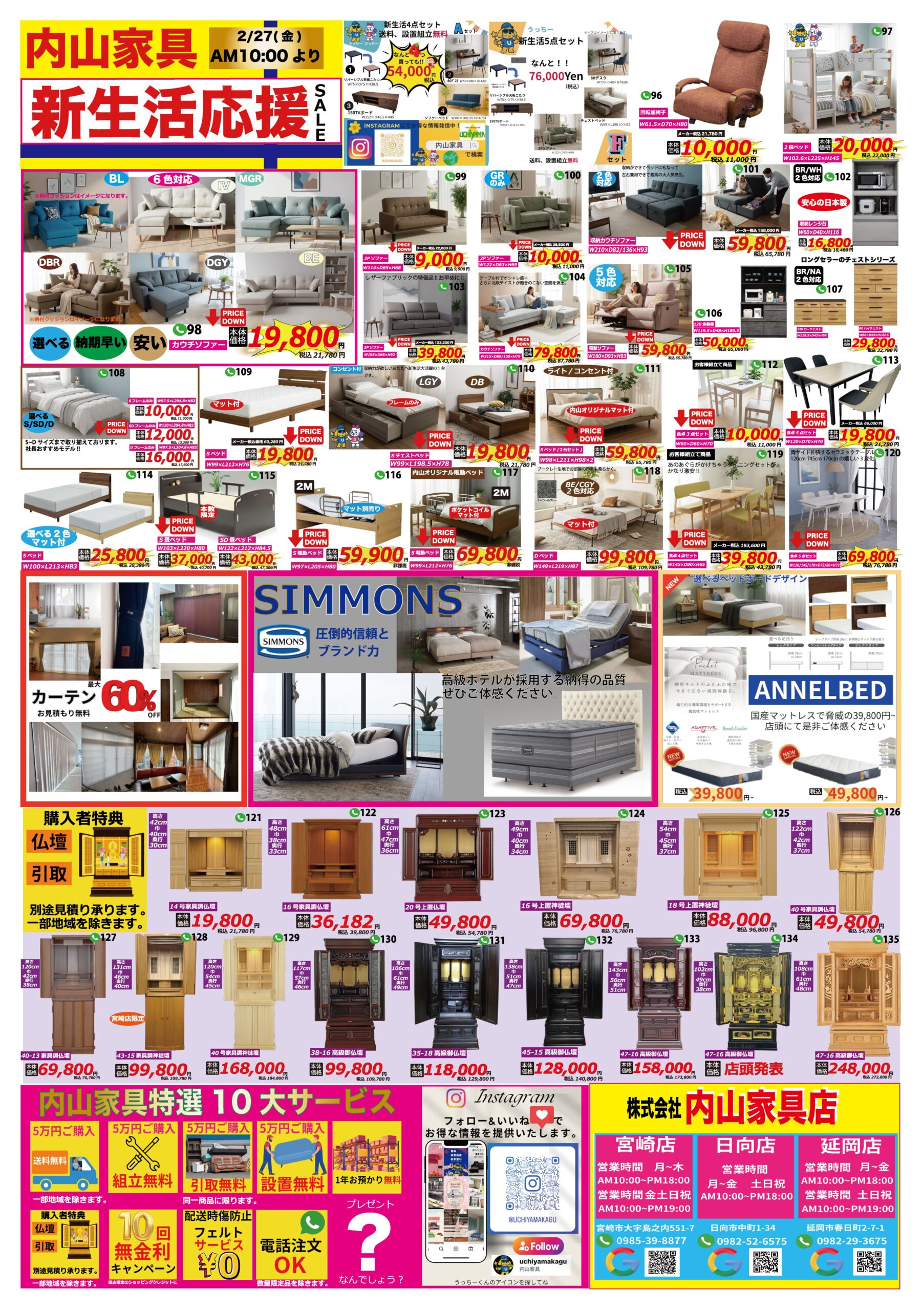 内山家具 宮崎本店〒880-0121宮崎市大字島之内551-7TEL:0120-11-5687(EC直通ダイヤル)TEL:0985-39-8877(店舗ダイヤル)FAX:0985-39-8844代表取締役:稲吉 勇介